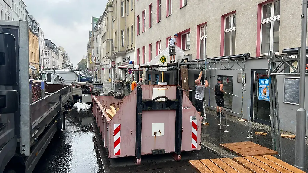 Auf dem Gehweg vor dem Haus, das sich nur wenige Meter vom bekannten Friedrichstadt-Palast entfernt befindet, wurde von Gerüstbauern ein sogenannter Passantenschutztunnel aufgestellt. So etwas steht auch vor Häusern, die saniert werden. Dann können die Bewohner sicher ins Haus kommen und die Fußgänger den Gehweg vor dem Haus nutzen. Die Straße blieb vor dem Haus zunächst weiter gesperrt.