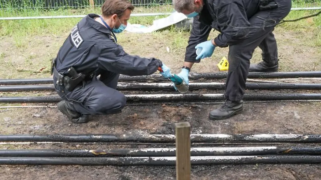 Grünheide (Mark) (dpa/bb) - Dicke, schwarze Stromkabel führen durch ein Waldstück nahe dem künftigen Tesla-Werk in Grünheide (Oder-Spree). Zäune sichern die Leitungen vor Unbefugten. Am Mittwoch ist die Spurensicherung des brandenburgischen Landeskriminalamtes (LKA) vor Ort. In der Nacht hatten die Kabel gebrannt. Die Spezialisten prüfen, wie es dazu kommen konnte. "Wir gehen davon aus, dass da jemand dran war", sagte der Sprecher des LKA Brandenburg, Joachim Lemmel. Ein vorliegendes Bekennerschreiben aus der linken Szene werde geprüft.