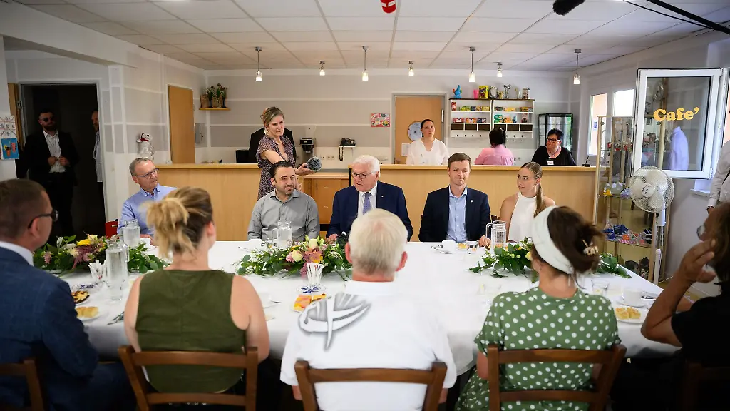 Steinmeier übernahm bei der Gesprächsrunde die Moderatorenrolle, stellte größtenteils Fragen und ließ die Anwesenden sprechen. Am Tisch saßen unter anderem der Bürgermeister Neuruppins, ein Unternehmer, ein Arzt, eine Studentin, der Gründer eines Kampfsportvereins und ein Schulleiter. Steinmeier hat seit Dienstag seinen Amtssitz für drei Tage nach Neuruppin (Landkreis Ostprignitz-Ruppin) verlegt. Er wolle in den drei Tagen "in das Alltagsleben einer Stadt" hineintauchen.