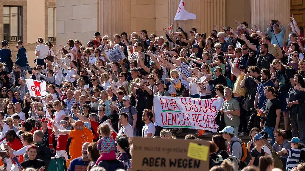 "Mehr Stunden, weniger Papa-Zeit" oder "Hände weg von der Bildung" hieß es etwa auf den Plakaten der Demo-Teilnehmer. Der Landtagsvorplatz war rappelvoll - die Veranstalter hatten etwa 6.000 Menschen angekündigt. Teile der Innenstadt waren für den Verkehr abgeriegelt.