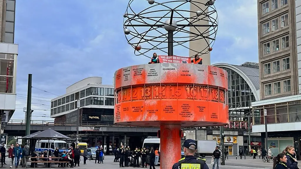 Berlin (dpa/bb) - Die Weltzeituhr auf dem Berliner Alexanderplatz ist von der Klimaschutzgruppe Letzte Generation mit oranger Farbe besprüht worden. Mehrere Mitglieder der Gruppe versprühten die Farbe am Dienstagmorgen gegen 9.00 Uhr aus vier Feuerlöschern auf die bekannte Touristenattraktion, die danach fast komplett orange war. Auch die Säule, auf der die Uhr steht, und der Boden unter der Uhr bekamen viel Farbe ab.