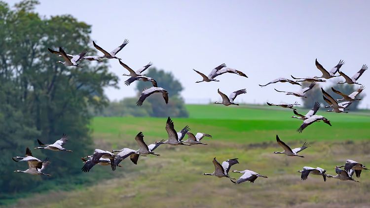 Laut Nabu fliegen insgesamt schätzungsweise 400.000 Kraniche über mehrere Wochen über ganz Deutschland. Die Rückkehr nach Deutschland beginne dann Mitte Januar/Anfang Februar.