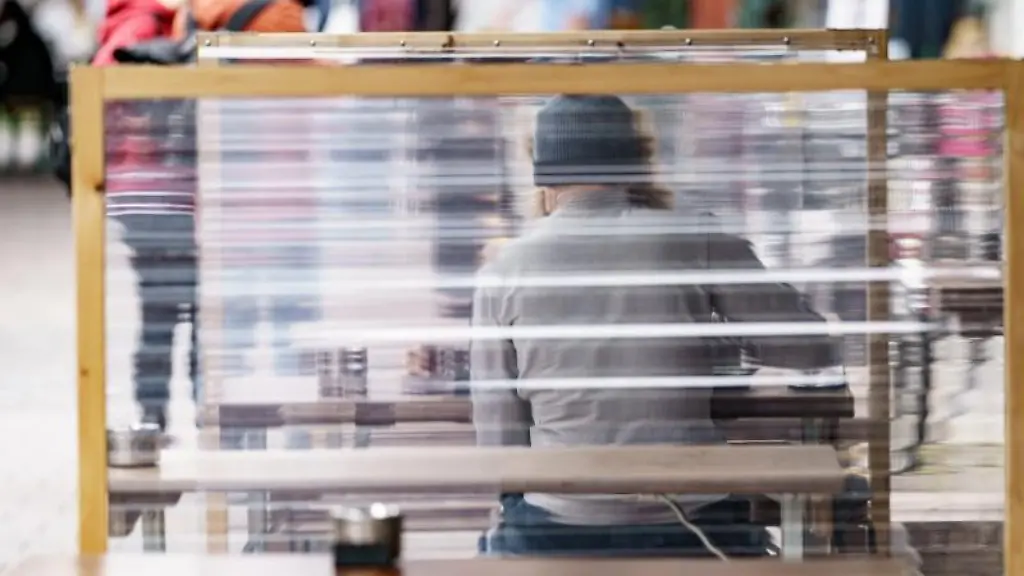 Gaeste-eines-Restaurants-warten-zwischen-Plexiglas-Trennscheiben-auf-ihre-Bestellung