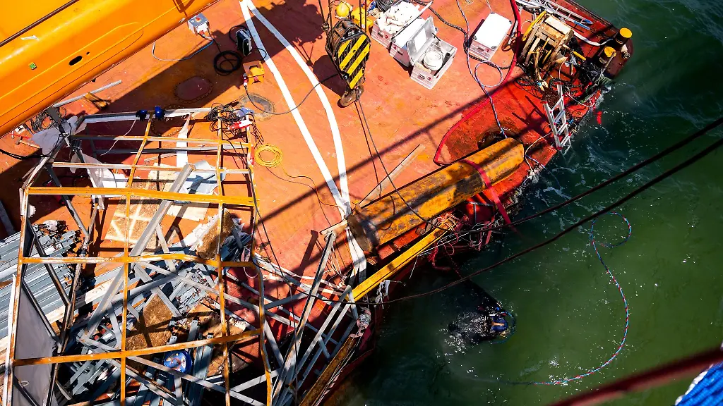 Anderthalb Wochen lag eine havarierte Plattform unter dem Rohbau der Seebrücke in Timmendorfer Strand fest. Jetzt hat ein Spezialschiff den Ponton weggeschleppt.