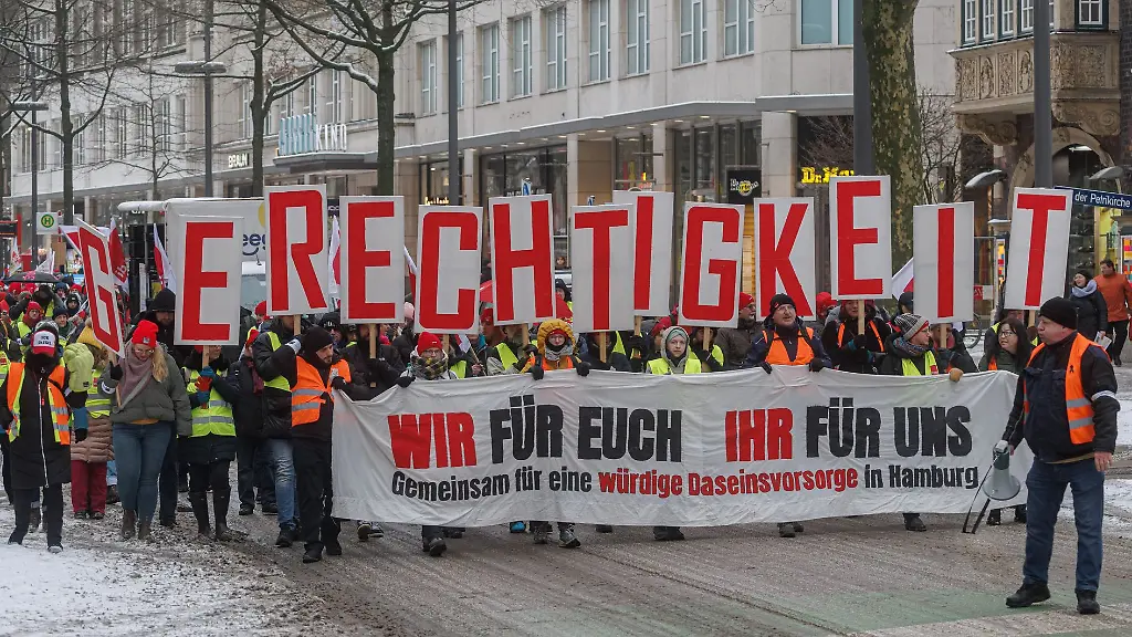 "Ihr seid ein Kraftzentrum, weil ihr hier in Hamburg gut aufgestellt seid, kämpferisch, entschlossen und gemeinsam", rief Werneke den Demonstranten zu. Diese waren zuvor vom Gewerkschaftshaus durch die Innenstadt zum Rathaus und von dort zur Finanzbehörde gezogen. Vor sich her trugen sie dabei auf großen Buchstaben das Wort "Gerechtigkeit" oder Plakate mit der Aufschrift "Druck auf den Dressel" und skandierten unter anderem "Mieten runter, Löhne rauf, Hamburg-Zulage obendrauf".