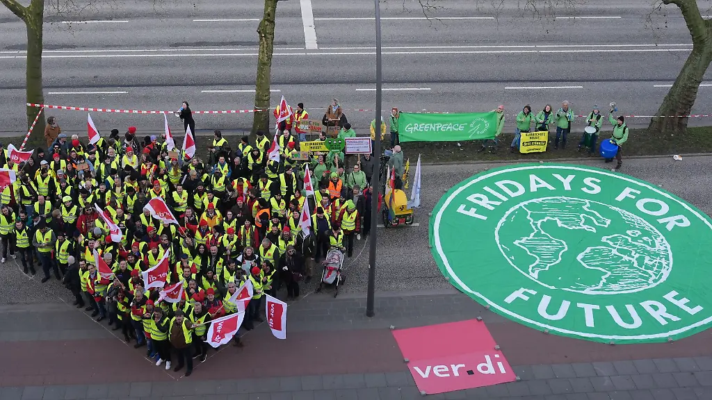 Hamburg (dpa/lno) - Die Klimabewegung Fridays for Future und die Gewerkschaft Verdi sind in der Hamburger Innenstadt gemeinsam für mehr Klimaschutz und eine Stärkung des öffentlichen Nahverkehrs auf die Straße gegangen. Hunderte Menschen zogen am Freitag vom Gewerkschaftshof am Besenbinderhof zum Rathaus. Die Demonstration war Teil der bundesweiten Kampagne "#WirFahrenZusammen" von Klimabewegung und Gewerkschaft. Wegen eines 48-stündigen Warnstreiks bei Hochbahn und VHH standen währenddessen die Busse und Bahnen in Hamburg den zweiten Tag in Folge still.