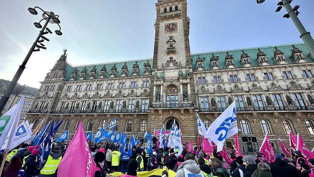Hamburg (dpa/lno) - Mehrere Hundert Beschäftigte der Stadt Hamburg haben sich an einem Warnstreik beteiligt und sind vor das Rathaus gezogen. Aufgerufen hatte der Beamtenbund dbb, der in der laufenden Tarifrunde des öffentlichen Diensts der Länder wie die Gewerkschaft Verdi sieben Prozent - zumindest aber 300 Euro - mehr verlangt.