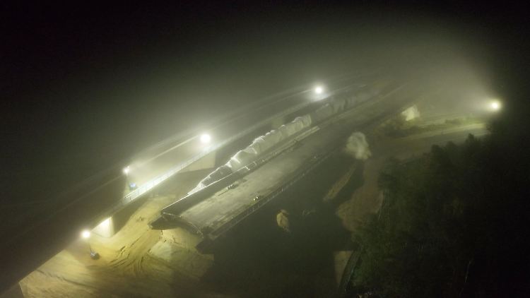 Rüsselsheim (dpa/lhe) - Lauter Knall am frühen Morgen: Wie geplant sind zwei alte Brückenteile über der Autobahn 67 am Rüsselsheimer Dreieck gesprengt worden. Nun müssen noch rund 4.500 bis 5.000 Tonnen Stahlbeton pro Bauwerk als Abbruchmaterial weggeschafft werden, wie die Autobahn GmbH mitteilte. Die A67 ist deswegen noch bis Montagfrüh um 5.00 Uhr gesperrt. Die Verbindungsrampen konnten am Samstagmorgen schon wieder freigegeben werden, wie ein Sprecher der Polizei in Darmstadt sagte.