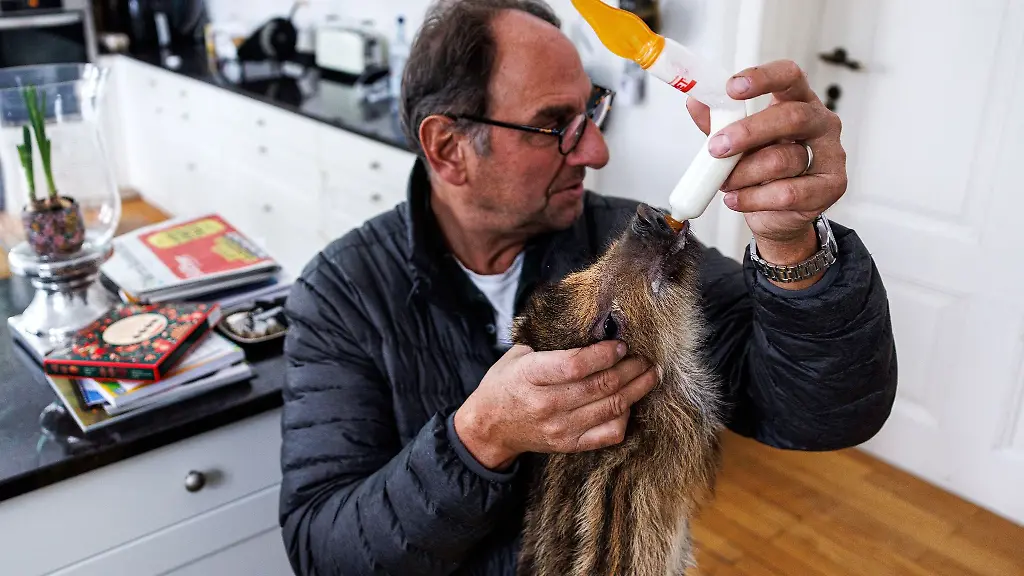 Ein Jäger fand die Jungtiere Anfang Dezember verwaist im Wald und brachte sie zu den Kaldens. Das Paar zieht die Frischlinge seither in seinem Wohnzimmer mit der Flasche auf. "Mit den jungen Tieren hier im Haus zu wohnen, ist eigentlich eine sehr erfüllende Sache", sagt Tierarzt Kalden. Im Stall könne man nicht so genau kontrollieren, ob sie sich wohlfühlten und was zu machen sei. "So leben sie mit uns zusammen, haben keine Angst vor Menschen, und dadurch hat die ganze Familie auch eine Menge Spaß mit ihnen."