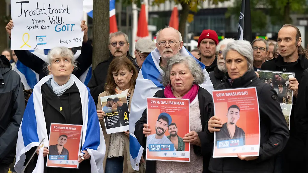Die proisraelischen Demonstranten forderten in Sprechchören und auf Plakaten die Freilassung der von der Terrororganisation Hamas festgehaltenen Geiseln. "Unsere Trauer um die Opfer des Massakers vom 7. Oktober 2023 ist unendlich", hieß es auf einem Plakat. Die Polizei schätzte die Zahl der Teilnehmerinnen und Teilnehmer auf rund 350.