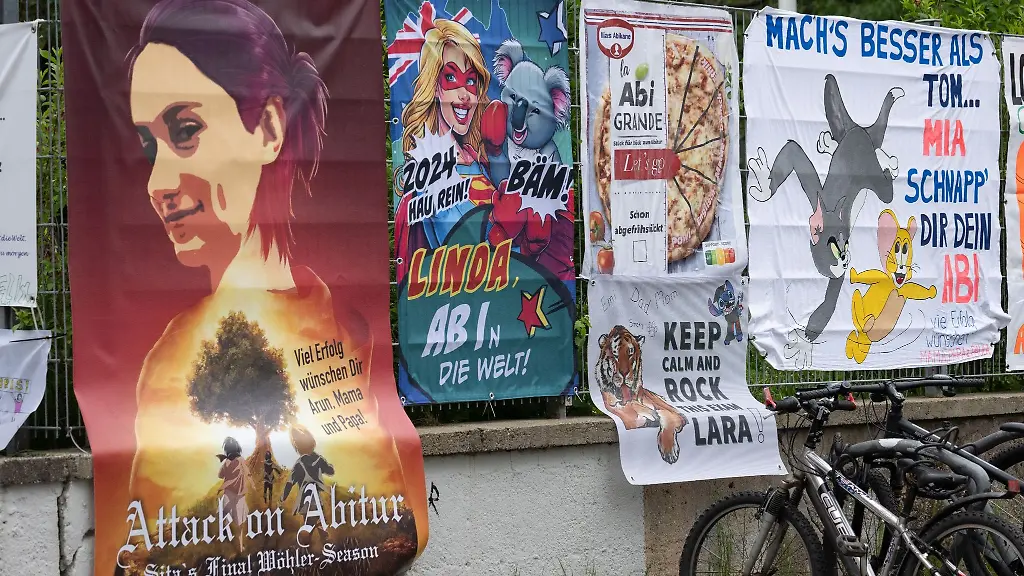"Lotti Karotti, zieh die letzte Rübe!" und "Mach's besser als Tom... Mia, schnapp dir dein Abi" So beispielsweise lauten gegenwärtig Sprüche auf bunten Stoff- und Kunststoffplanen an einer Frankfurter Schule. Am Gymnasium Eltville steht: "Abi 2024 - Chiara, du Löwin, beiß dich durch!" und "Laurenz, angel dir dein Abitur".
