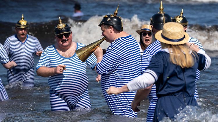 Die Mutigen, die sich ins Wasser wagten, trugen einen bunten Mix aus Badekleidung verschiedener Zeiten; darunter blau-weiß gestreifte Bekleidung, die viel Haut bedeckte. Unter ihnen waren traditionell viele Hoteliers mit ihren Gästen. Auch Mitglieder des Zigarrenclubs Düsseldorf sprangen in die Fluten der Ostsee. Mit dem Wetter hatten sie Glück: Es gab blauen Himmel und strahlenden Sonnenschein.