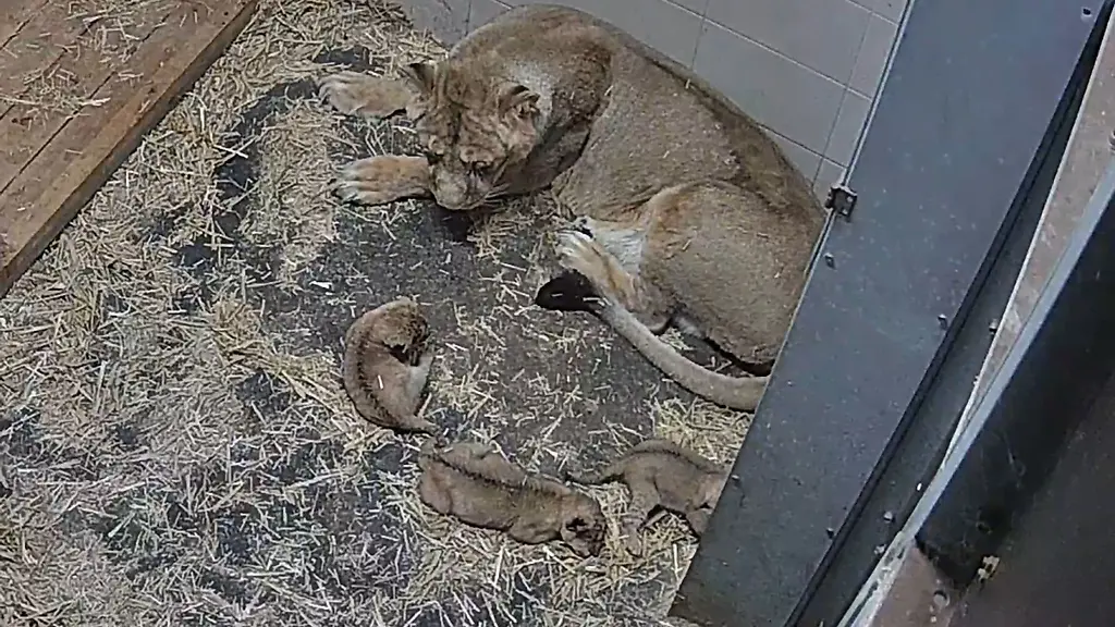 Drei Asiatische Löwenbabys sind im Schweriner Zoo geboren. Mutter Heidi kümmert sich fürsorglich um den Nachwuchs – Besucher können das Geschehen live auf einem Bildschirm verfolgen.