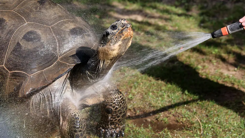 Rostock (dpa/mv) - Abkühlung für die Galapagos-Riesenschildkröten im Rostocker Zoo: Mit einem Wasserschlauch erhalten die Tiere in ihrem Außengehege eine kalte Dusche, denn auch in Rostock herrscht heißes Sommerwetter mit Temperaturen um die 30 Grad. Galapagos-Riesenschildkröten bewegen sich wenig und schlafen bis zu 16 Stunden am Tag.