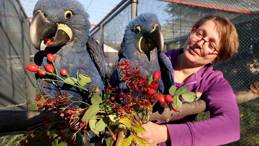 Die kobaltblauen Hyazintharas sind nach Angaben des Vogelparks die größte flugfähige Papageienart und können bis zu einem Meter - gemessen vom Kopf bis zur Schwanzfeder - groß werden. Das kobaltblaue Gefieder steht im starken Kontrast zu dem gelben Augenring und dem gelben Hautflecken neben dem unteren Schnabel.