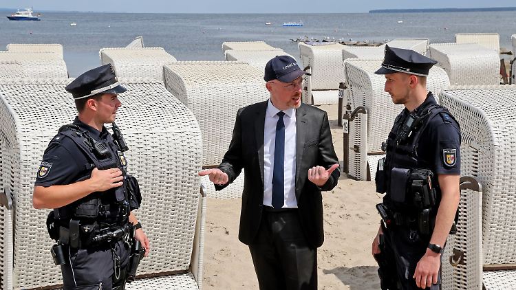 Ueckermünde (dpa/mv) - Mecklenburg-Vorpommerns Innenminister Christian Pegel (SPD) ist am Donnerstag mit Polizisten des Bäderdienstes im Strandbad Ueckermünde (Landkreis Vorpommern-Greifswald) auf Streife gegangen. "Das vorrangige Ziel ist es, durch sichtbare Präsenz der Beamtinnen und Beamten vor Ort, auf den Campingplätzen, auf den Uferpromenaden und an den Stränden unseres Landes, Straftaten schon im Vorfeld zu verhindern", erklärte Pegel die verstärkte Präsenz von Polizisten in den Badeorten und Touristenzentren im Sommer. Es sei wichtig, schnell zur Stelle zu sein.