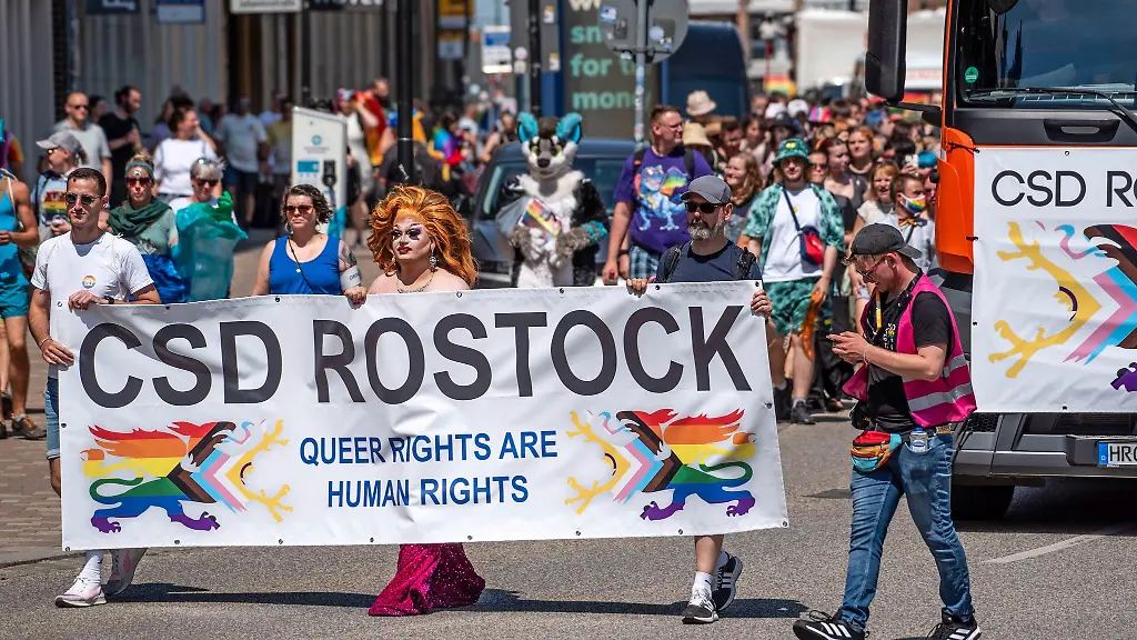 Bei hochsommerlichen Temperaturen feiern Tausende Menschen in der Rostocker Innenstadt den Christopher Street Day (CSD). Einige kommen dabei ganz schön ins Schwitzen.