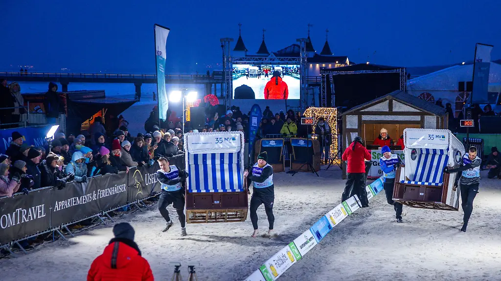 "Der Boden war wesentlich fester und gefrorener und dadurch konnte man einfach bessere Zeiten laufen", freuten sich die Sieger. Rund 60 Kilogramm wog der Strandkorb, den die Zweierteams über die 20 Meter lange, gefrorene Sandstrecke zum Ziel trugen.
