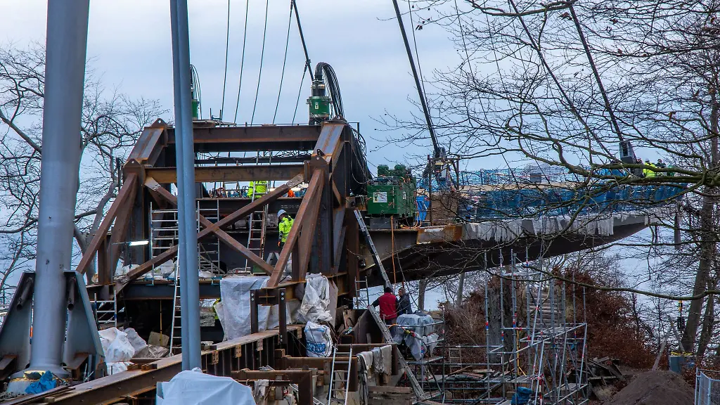 Die letzte Bewegung war witterungsbedingt nochmals um einen Tag verschoben worden - nun ist der neue Skywalk über Rügens Steilküste endgültig in Position. Bis er öffnet, dauert es aber noch.