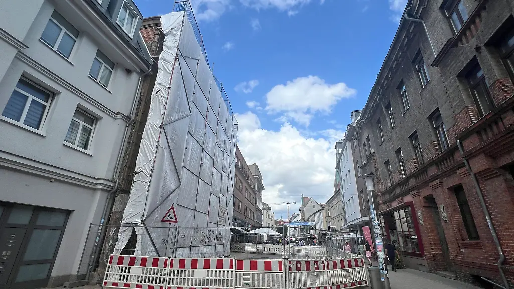Schwerin (dpa/mv) - Im Schweriner Stadtzentrum ist wegen akuter Einsturzgefahr eines historischen Gebäudes ein Teil der viel genutzten Fußgängerzone in der Mecklenburgstraße gesperrt worden. Der Lieferverkehr könne aufgrund der weiträumigen Absperrung des Bereichs nicht vorbeifahren und werde über die Schloßstraße umgeleitet, teilte die Stadtverwaltung mit. Fußgänger und Radfahrer können demnach weiterhin die Stelle passieren. Die Sperrung soll laut Stadt bis voraussichtlich Ende September andauern.