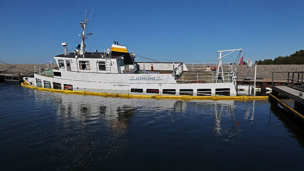 Lubmin (dpa/mv) - Nach dem Untergang des Restaurantschiffs "Vaterland" in der Marina Lubmin (Kreis Vorpommern-Greifswald) ist das weitere Vorgehen unklar. Das Schiff war am Dienstag aus bislang ungeklärter Ursache vollgelaufen und liegt seitdem auf Grund. Nur die Aufbauten ragen noch aus dem Wasser.