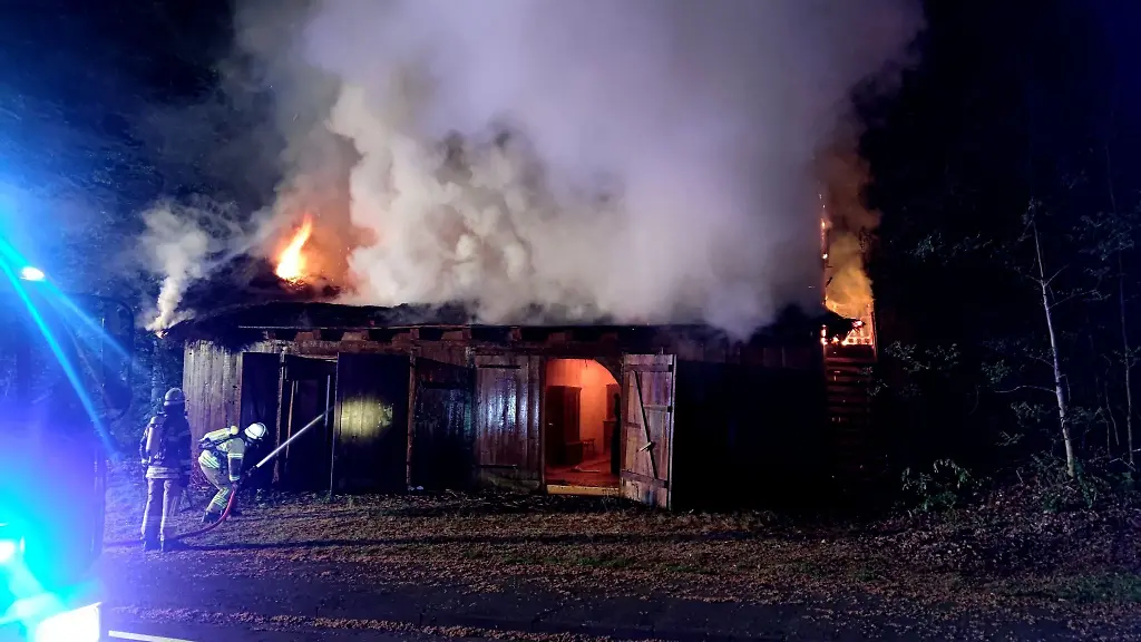 Eine historische Scheune am Heidemuseum Rischmannshof steht in Flammen. Zumindest einige eingelagerte Exponate können die Feuerwehrleute in Sicherheit bringen.