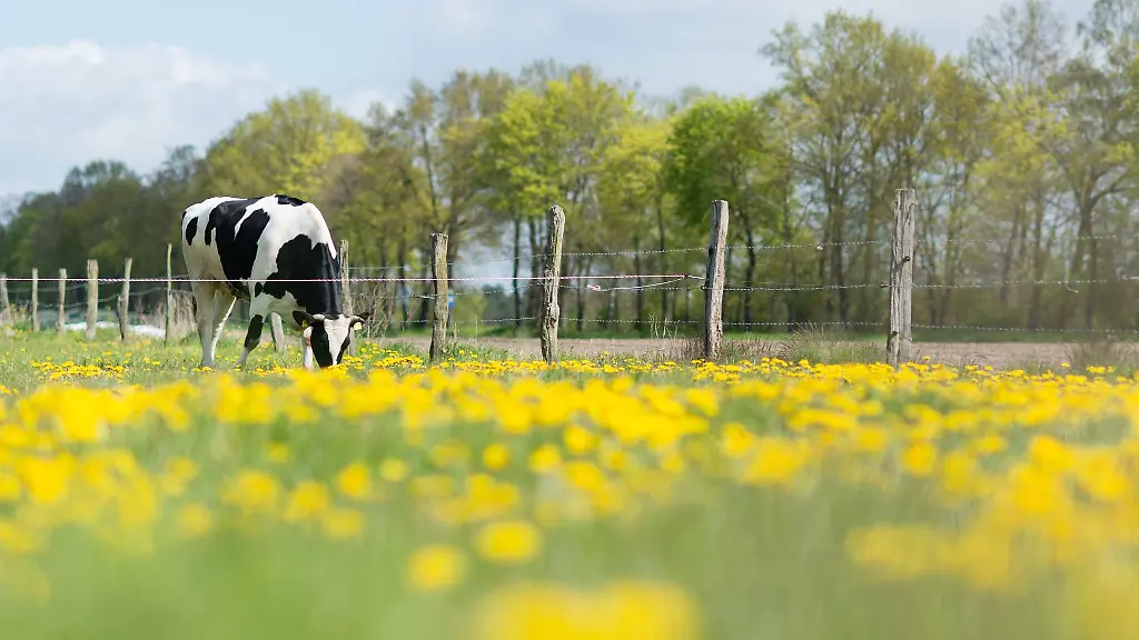 Eine-Kuh-steht-auf-einer-Weide-mit-viel-Loewenzahn