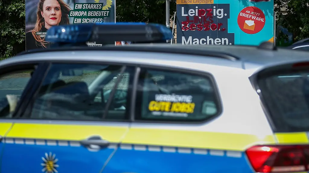 Ein-Streifenwagen-der-Polizei-faehrt-an-Wahlplakaten-vorbei