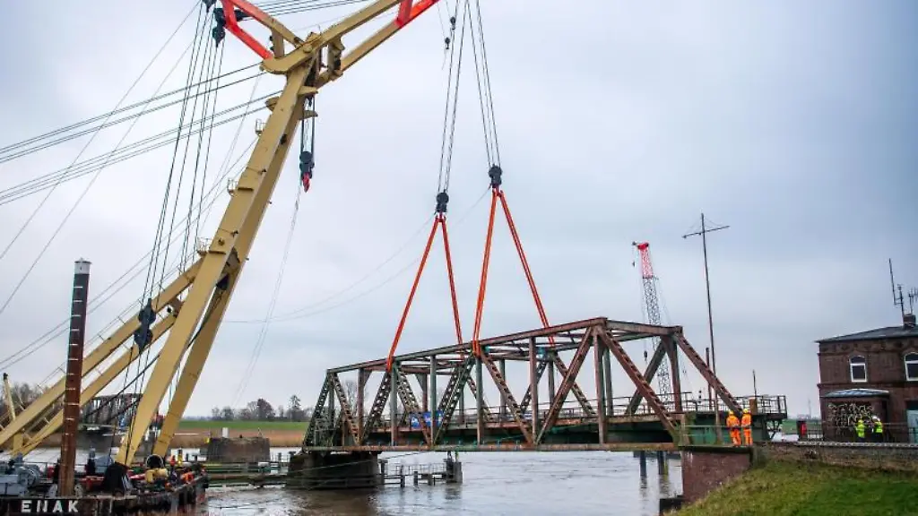 Weener (dpa/lni) - Der Abbau der Überreste der zerstörten Friesenbrücke über die Ems bei Weener in Ostfriesland hat begonnen. Am Donnerstagnachmittag hob Schwimmkran "Enak" eine noch übrig gebliebene, tonnenschwere Stahlkonstruktion der alten Friesenbrücke aus seiner Verankerung. Das Brückenteil sollte dann zur weiteren Verschrottung auf einem Lagerplatz bei der Papenburger Meyer-Werft abgelegt werden, sagte eine Bahnsprecherin. Dort soll das Stahlteil dann zerteilt und abtransportiert werden. Zuvor hatten Arbeiter in den vergangenen Tagen alles für den Abbau vorbereitet. In den kommenden Wochen bis ins neue Jahr hinein sollen auch die weiteren noch übrigen Brückenteile abgebaut werden, sagte die Sprecherin.