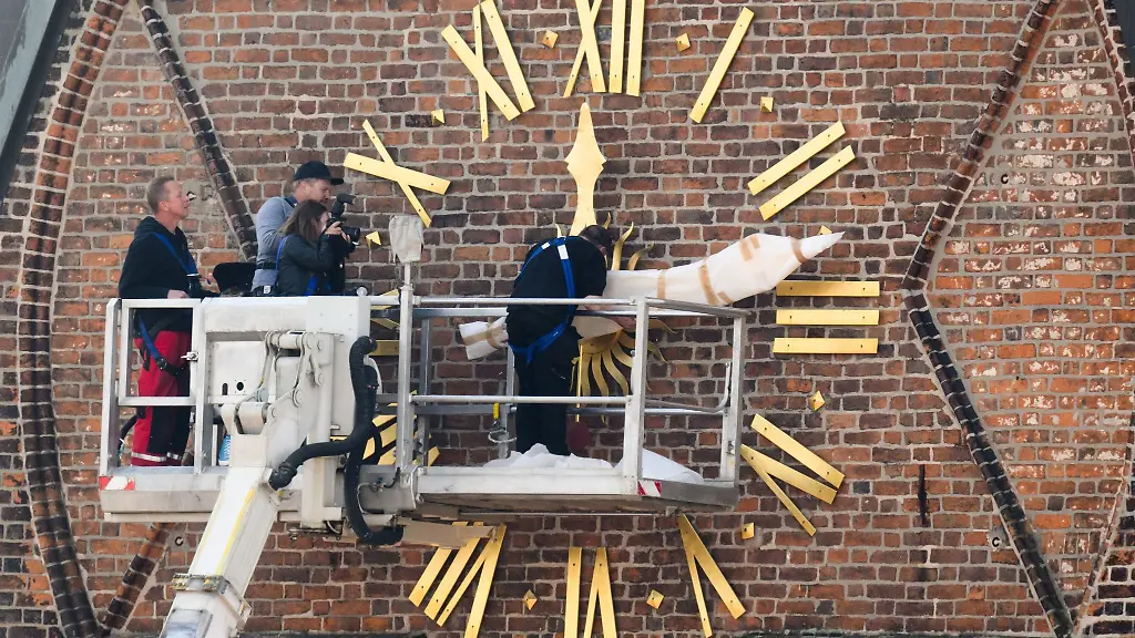 Das Sturmtief "Nadia" hatte Ende Januar den kleinen Stundenzeiger stark verbogen. Eine auf Turmuhren und Glockenspiele spezialisierte Firma aus Melle demontierte beide Zeiger, verstärkte und schmierte sie und vergoldete sie neu. Es sei die erste Reparatur gewesen, seit die Turmuhr im Juli 1952 in Betrieb genommen wurde - nach dem Wiederaufbau der kriegszerstörten Marktkirche, sagte die Sprecherin. Das Wiederanbringen war zunächst für Anfang April geplant gewesen, aber damals war es zu windig, hieß es.