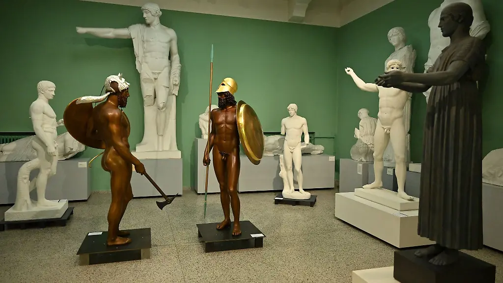 Die Skulpturen im Mittelpunkt der Ausstellung zeigen einen nackten Krieger, einen erschöpften Faustkämpfer und den sogenannten Thermenherrscher – ein an einem Stock stehender nackter Mann. Ihre Kopien wurden für ein Forschungsprojekt des Frankfurter Liebieghauses gefertigt und von dort entliehen.