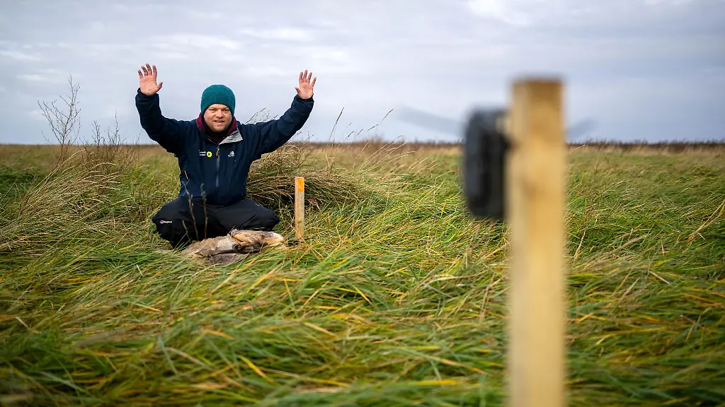Greetsiel (dpa/lni) - Auf einen grünen Schlitten lädt Benedikt Wiggering alles, was er gleich im Nationalpark Niedersächsisches Wattenmeer braucht: zwei Holzpfähle, einen langen Holzhammer, Kabelbinder, eine Kamera – und ein totes Reh, verpackt in einen blauen Plastiksack. "Wir haben alles", sagt der Biologe zu seinem Kollegen, dem Nationalpark-Ranger Jochen Runar. In Gummistiefeln laufen die beiden vom Auto am Deich in die Salzwiese. Den Schlitten, auf dem der Rehkadaver liegt, ziehen sie hinter sich her.