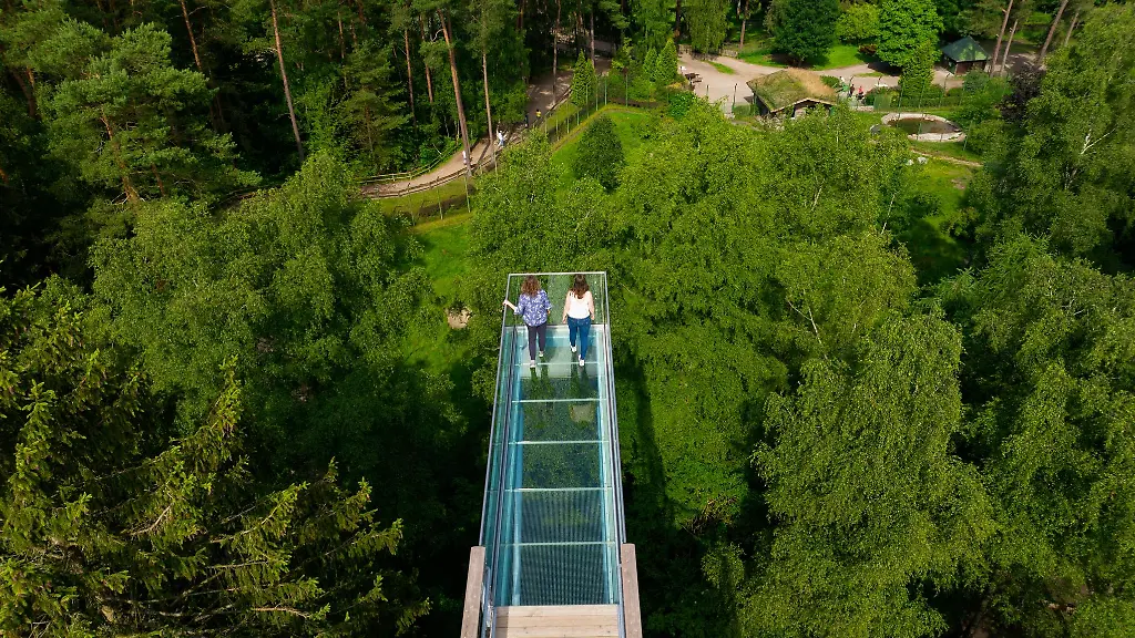 Nindorf-Hanstedt (dpa/lni) - Ganz vorsichtig, Schritt für Schritt, tasten sich die Familien an die neue Attraktion am Baumwipfelpfad "Heide Himmel" im Wildpark Lüneburger Heide heran. Von der gläsernen Aussichtsplattform "Skywalk Tigerblick" können Besucher und Besucherinnen rundum über die Landschaft und auch die Tiergehege am Boden blicken. Bei gutem Wetter sind der Hamburger Hafen, die Elbphilharmonie oder auch der Wilseder Berg in Sichtweite.