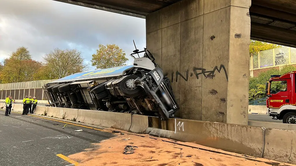 Durch den Unfall seien vier weitere Wagen von umherfliegenden Trümmerteilen beschädigt worden, berichtete die Polizei. Ein Statiker musste die Brücke, an deren Pfeiler der Lastwagen geprallt war, auf ihre Standfestigkeit überprüfen.