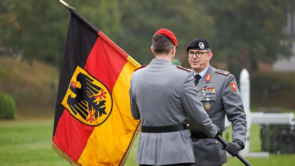 Augustdorf (dpa/lnw) - Mit einem feierlichen Fahnenappell hat die Bundeswehr in Augustdorf in Nordrhein-Westfalen einen neuen Verband in Dienst gestellt. Als Teil der Panzerbrigade 21 soll das Artilleriebataillon 215 in Zukunft schnell an die Nato-Ostflanke verlegt werden können und dort mit seinen Radhaubitzen und unbemannten Waffensystemen die Kampftruppen aus dem Hinterland unterstützen. Die Geschosse haben eine Reichweite von bis zu 40 Kilometern. Diese Fahrzeuge werden nicht von schweren Ketten angetrieben und benötigen für die Verlegung zum Beispiel nach Litauen keine Bahnlinien oder Schwertransporter.