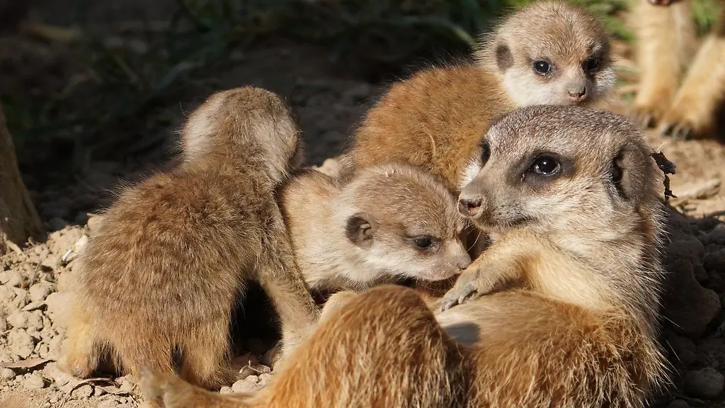 Im Februar wurden vier Erdmännchen-Jungtiere im Klever Zoo geboren, nun haben sie die Wurfhöhle der Mutter verlassen und erkunden ihre Umgebung.