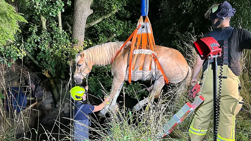 Eine Tierärztin untersuchte das Pferd und stellte keine Verletzungen fest. Es konnte nach der abendlichen Aktion mit Einsatzkräften mehrerer Feuerwehren gegen Mitternacht wohlbehalten in seinen Stall zurückkehren.