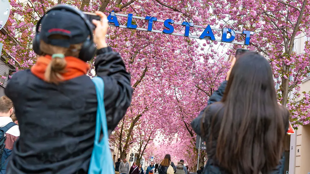 Die Kirschblüte in der Bonner Altstadt hat sich über die Jahre zu einem Touristenmagneten entwickelt und ist ein beliebtes Fotomotiv. Die japanischen Nelkenkirschen wurden in den 1980er Jahren auf beiden Seiten der engen Altstadtstraßen gepflanzt und sind inzwischen so groß, dass die Blütenzweige ein rosafarbenes Dach bilden.
