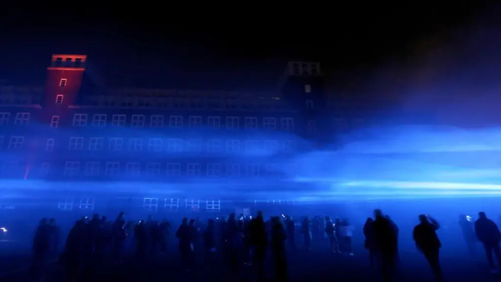 Oberhausen (dpa/lnw) - Zum Auftakt des fünfmonatigen Medienkunstfestivals "Futur 21" der NRW-Industriemuseen hat der Niederländer Daan Roosegaarde das Gelände rund um den Peter-Behrens-Bau in Oberhausen mit blauem Licht geflutet. Die Installation "Waterlicht" verwandelt die Fläche am LVR-Museumsdepot und einstigen Lagerhaus im Bauhaus-Stil in ein rauschendes digitales Lichtmeer, in das die Besucher am Freitag- und Samstagabend eintauchen können.