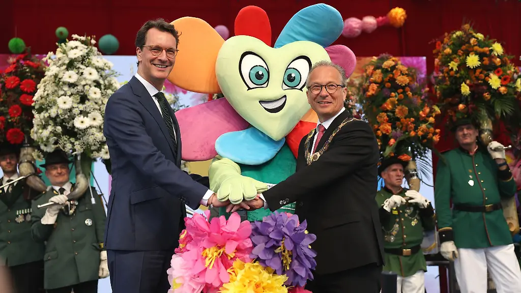 Breuer und Wüst drückten im symbolischen Moment der Eröffnung gemeinsam eine große Taste. Bunte Papierschnipsel flogen dabei durch die Luft. Zuvor präsentierten Jäger in großen Hörnern bunte Blumengestecke.