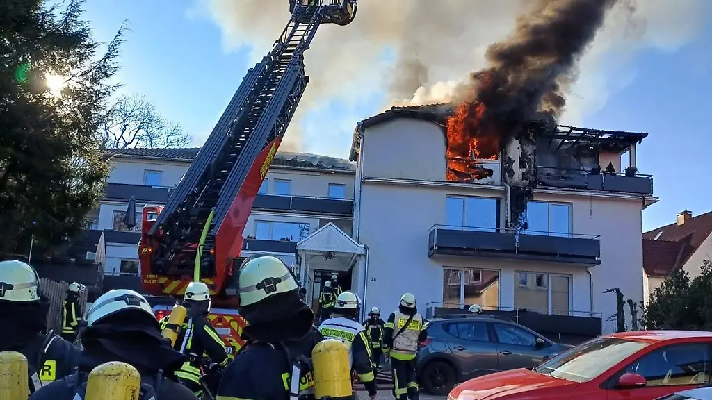 Horn-Bad Meinberg (dpa/lnw) - Ein Dachstuhlbrand hat ein Mehrfamilienhaus in Horn-Bad Meinberg im Kreis Lippe größtenteils zerstört. Das Haus mit 19 Wohnungen ist laut Feuerwehr nicht mehr bewohnbar. Ein Feuerwehrmann wurde bei den Löscharbeiten leicht verletzt. Die Bewohner des Hauses konnten sich selbst in Sicherheit bringen. Eine Wohnung im zweiten Stock sowie das Dachgeschoss standen in Vollbrand, wie es hieß.