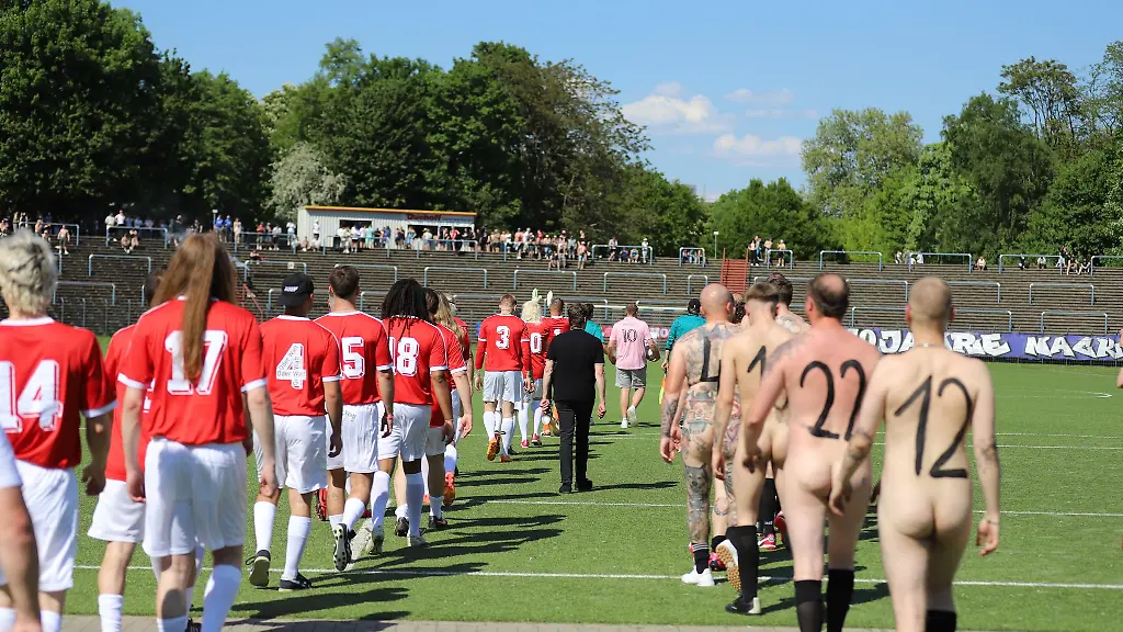 Seit zehn Jahren spielen sie hüllenlos, aber nicht ohne Botschaft: Die "Nacktionalmannschaft" feiert Jubiläum – und freut sich über ein ausverkauftes Spiel in Herne.