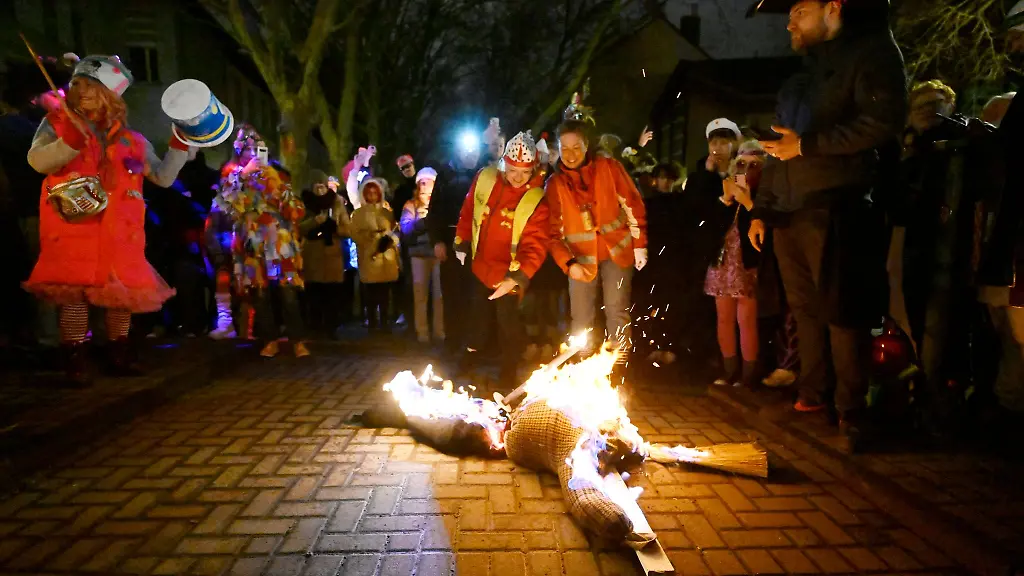 Köln (dpa/lnw) - Mit der traditionellen Verbrennung des Nubbels ist in Köln am Abend der Straßenkarneval zu Ende gegangen. In zahlreichen Veedeln versammelten sich Jecken vor Kneipen und auf Plätzen, um die Strohpuppe unter lautem Wehklagen zu verbrennen.