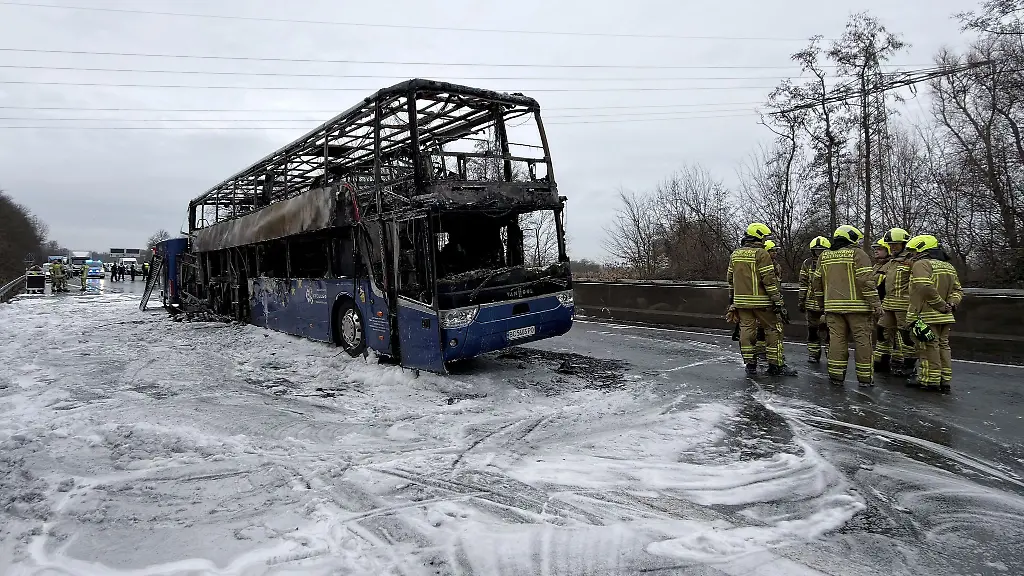 Ratingen (dpa/lnw) - Ein Reisebus ist am Morgen auf der Autobahn 52 bei Ratingen am Breitscheider Kreuz vollständig ausgebrannt. Die sieben Menschen in dem Fahrzeug seien alle rechtzeitig herausgekommen und es sei niemand verletzt worden, teilten Polizei und Feuerwehr mit. Die Autobahn blieb in Fahrtrichtung Essen für mehrere Stunden gesperrt, zeitweise bildete sich ein kilometerlanger Stau. Brandursache war vermutlich ein technischer Defekt im Motorraum.