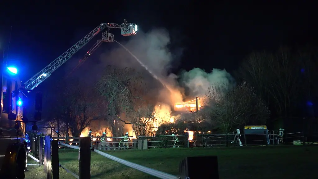 Essen (dpa/lnw) - Bei einem Brand auf einem Gehöft in Essen haben die Flammen eine Reithalle weitgehend zerstört. Zwei Bewohner und die Pferde in benachbarten Ställen blieben aber unversehrt, wie ein Polizeisprecher sagte. Feuerwehrleute verhinderten, dass das Feuer auf den Wohntrakt übergriff. Der Brand war am frühen Sonntagmorgen entstanden. Die Ursache war aber zunächst noch unklar. Auch über die Schadenshöhe gab es am Sonntag noch keine Angaben von der Polizei. Das Gebiet war von starker Rauchentwicklung betroffen. Rund 80 Feuerwehrleute waren im Einsatz.