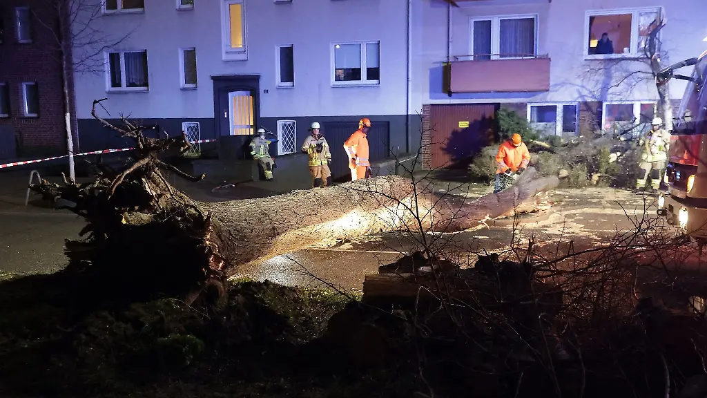 Duisburg (dpa/lnw) - Der Sturm hat in Nordrhein-Westfalen in der Nacht zum Samstag die Einsatzkräfte in Atem gehalten. Im Kreis Steinfurt starb ein 56 Jahre alter Mann, nachdem sein Auto von einem Baum getroffen wurde. Im Kreis Borken waren allein rund 1000 Einsatzkräfte von Feuerwehr und Technischem Hilfswerk im Einsatz. Die Kreisleitstellte zählte bis Mitternacht 460 Einsätze. Neben entwurzelten Bäumen mussten sich die Helfer auch um Gebäudedächer kümmern, die vom Sturm weggerissen wurden.
