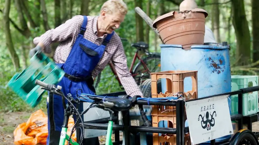 Ein-freiwilliger-Muellsucher-laedt-den-am-Rhein-gefundenen-Muell-auf-ein-Lastenrad