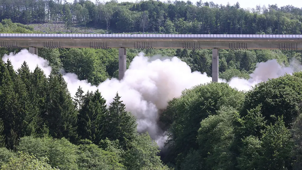 Im Mai 2023 war bereits die westliche Brückenhälfte gesprengt worden. Die Sprengmeister wollen den verbleibenden Brückenteil um 11.00 Uhr zu Fall bringen. Bevor der Verkehr wieder über die direkt angrenzende neue Brücke auf westlicher Seite rollen kann, muss er nach der Sprengung erst gründlich überprüft werden, hieß es von der Autobahn GmbH.