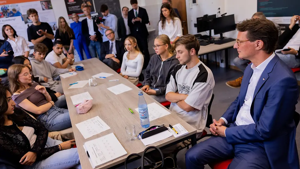 Im Kreise von Schülerinnen und Schülern in der Qualifikationsphase für das Abitur (Q1) informierte sich Wüst über das Programm und das Echo bei den Jugendlichen, die alle große Studienziele nannten: Astrophysik, Psychologie oder auch ein Pflege-Studium. Stufensprecher Amad, der zuvor an einer Realschule war, lobte das besondere Engagement der Beratungslehrerin und ihrer Mitstreiter in der Berufsorientierung. "Sie unterrichten, weil sie das mögen. Wenn die Lehrer Spaß haben, dann fühlt sich das nicht wie Schule an und es bleibt auch im Kopf", berichtete er dem NRW-Regierungschef über den Unterricht.