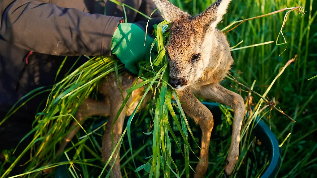 Sie trägt Handschuhe und fasst das Kitz mit Gras-Bündeln an. "Das Tier soll nicht den Geruch von Menschen annehmen. Sonst besteht die Gefahr, dass die Mutter es später ablehnt." Ihr Team ist mehrmals die Woche im Einsatz.